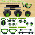 Converts into dumbbells, barbell, kettlebell, and push-up bars for full-body training. -