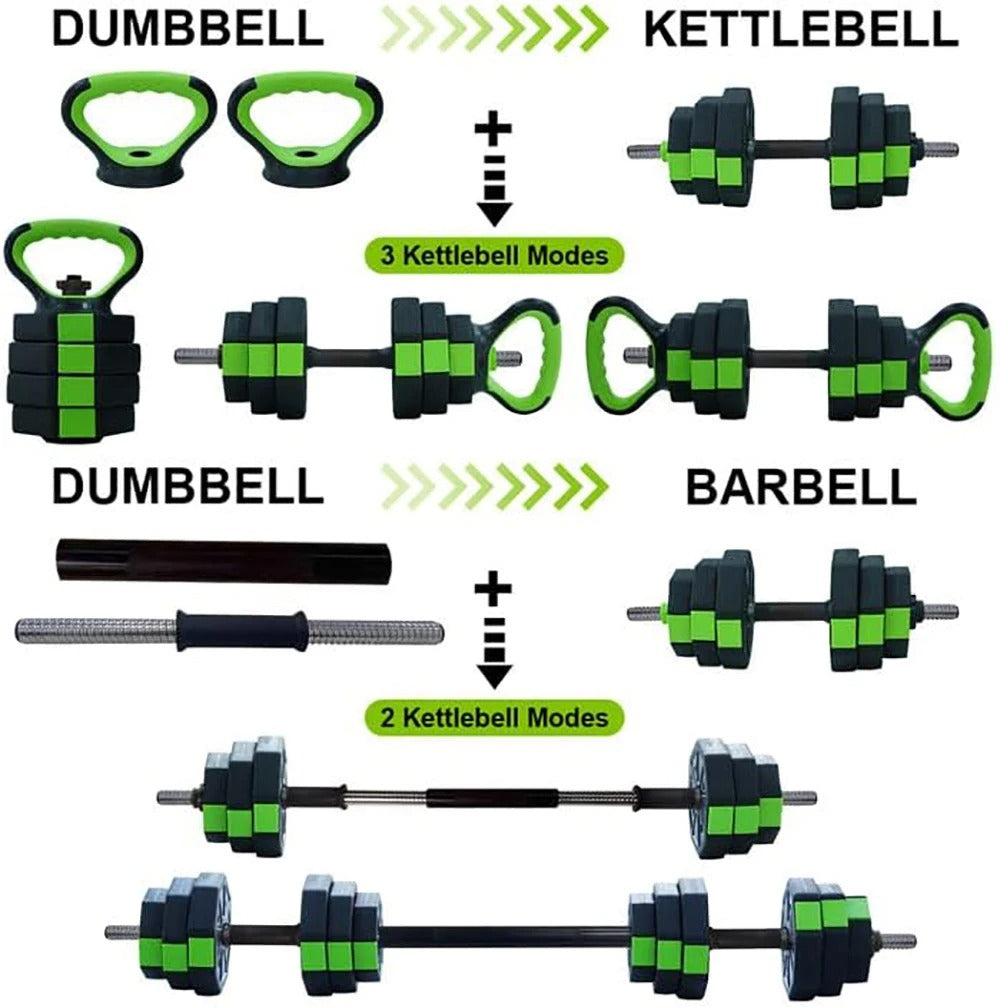 Upgrade your home workouts with this all-in-one adjustable dumbbell set! Designed for maximum versatility, this 44LB weight set easily transforms into a kettlebell, barbell, push-up stand, and standard dumbbells. Whether you're targeting strength, endurance, or core training, this compact, space-saving set has everything you need for a full-body workout at home.